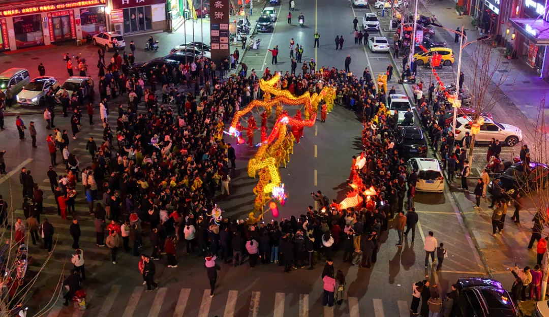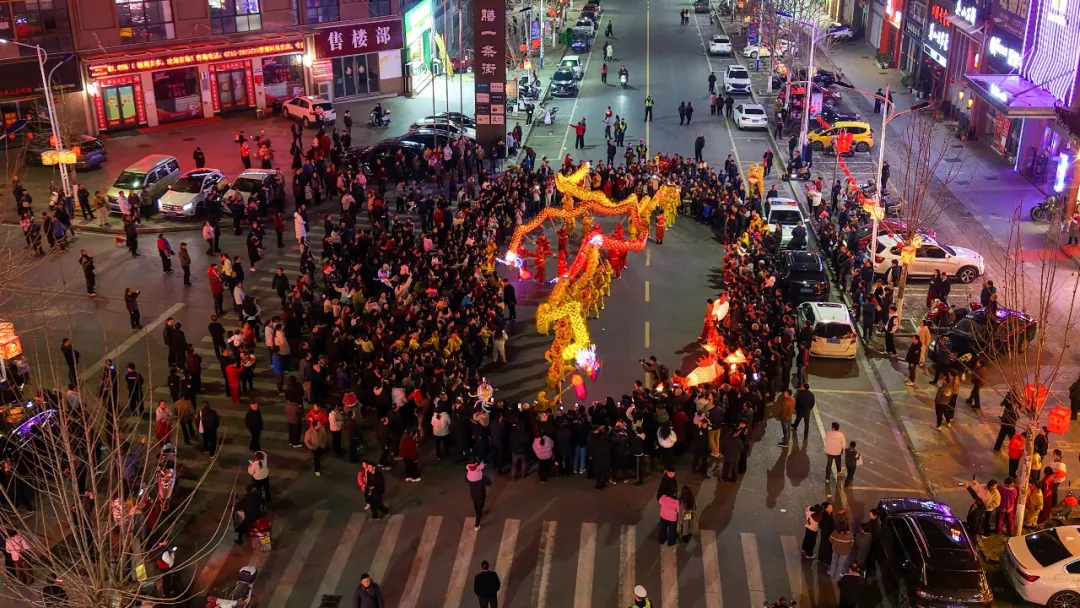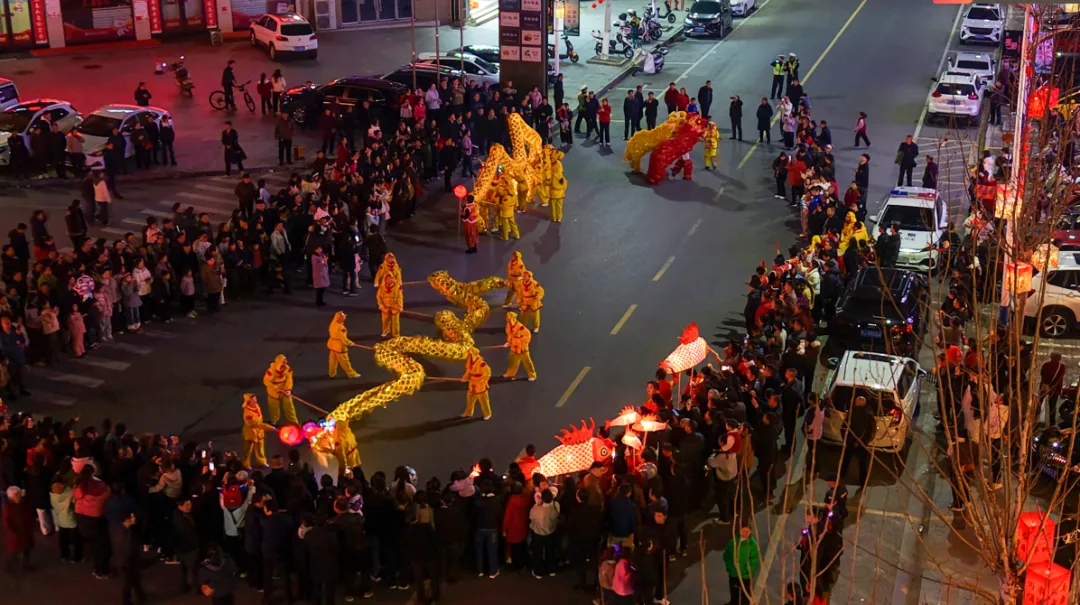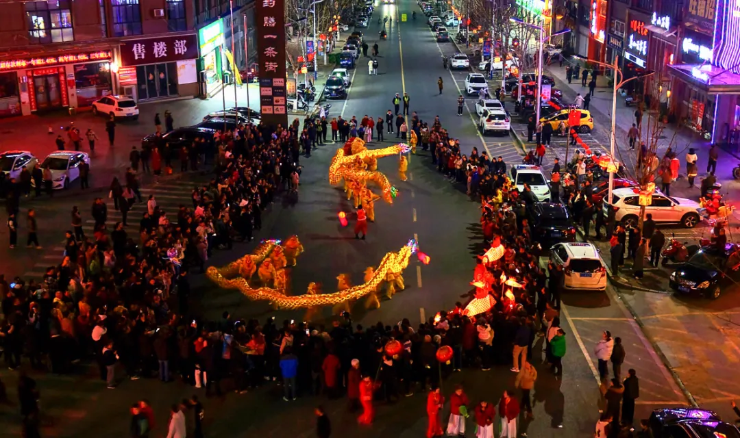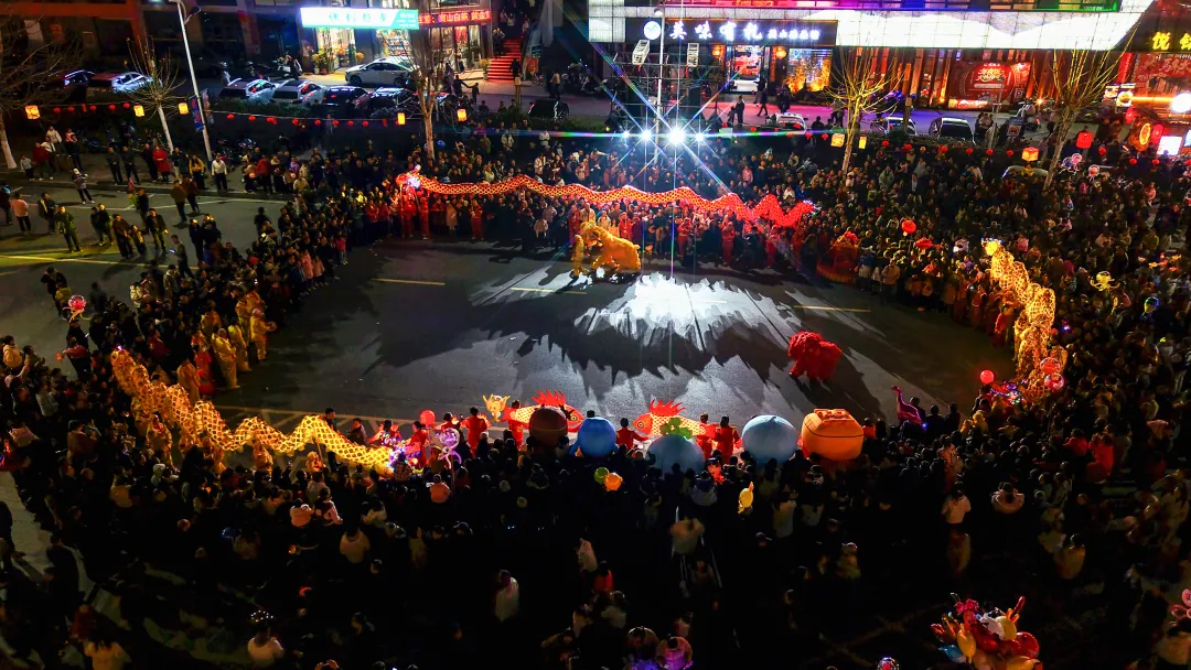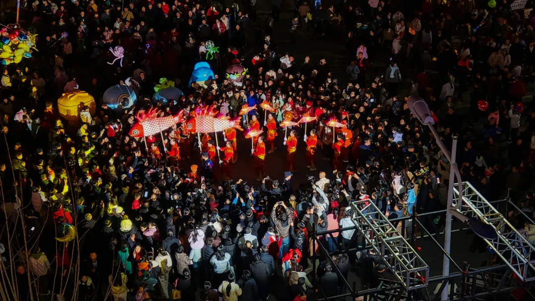 活动进入高潮,龙狮和民俗队伍前往洪广与夜市街交叉路口,进行龙狮狂欢,三条龙灯纷纷起舞,摆出各种各样造型,祈五谷丰登、国泰民安,彰显团结奋进。