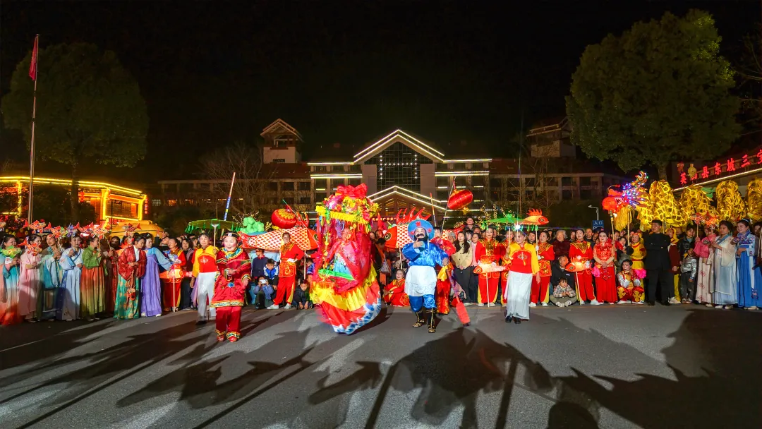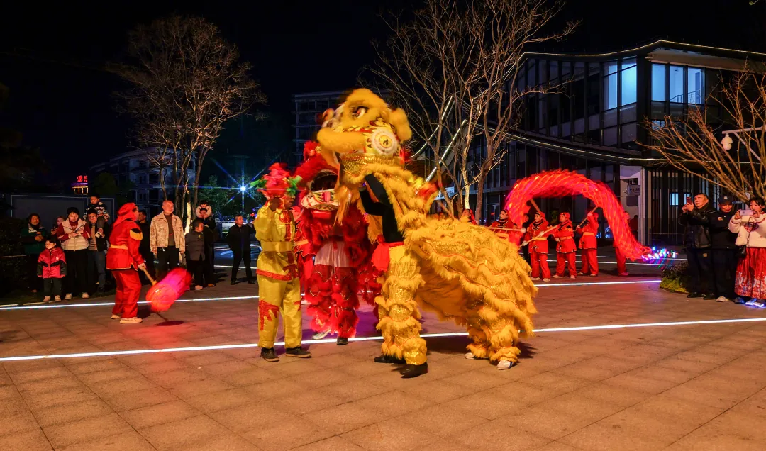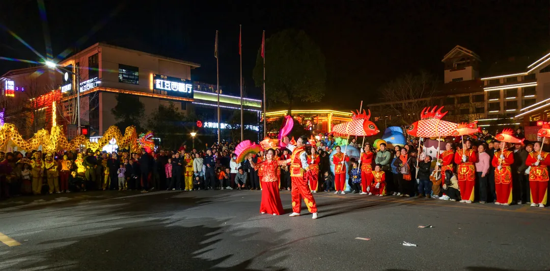 在洪广酒店门口舞龙舞狮隆重登场,三条巨龙民俗腾空而起,雄狮腾跃翻滚,“三龙腾飞狮跃”的壮观场面引得观众阵阵喝彩,瞬间点燃了观众的热情。采莲船、蚌壳精、连湘舞等传统民俗表演轮番登场,鱼灯摇曳生辉,财神爷、毕昇妙音和主持人沿途互动送福,所到之处观众纷纷拍照留影欢呼。
