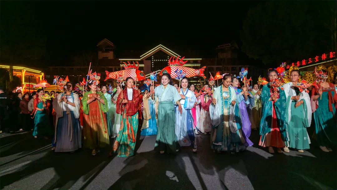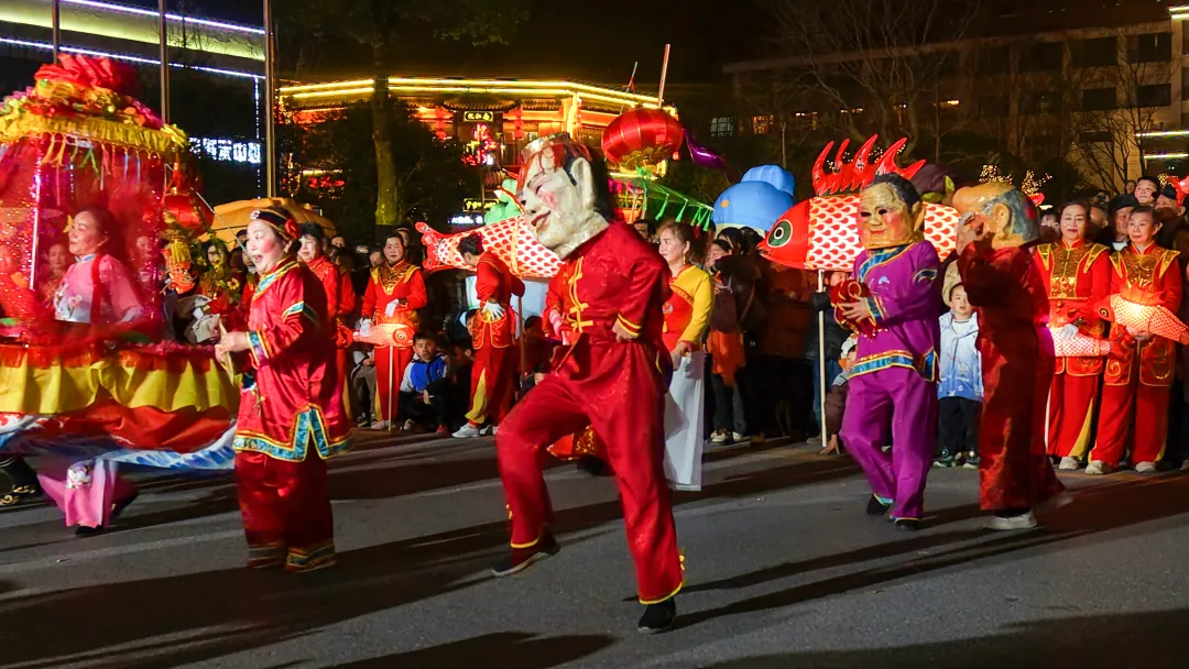 夜幕降临,华灯初上, 随着锣鼓声起,有舞龙舞狮队、财神爷、采莲船、毕昇妙音、蚌壳精、连湘、大头宝儿、鱼灯、旗袍走秀等200多人的巡游队伍开始了巡游。